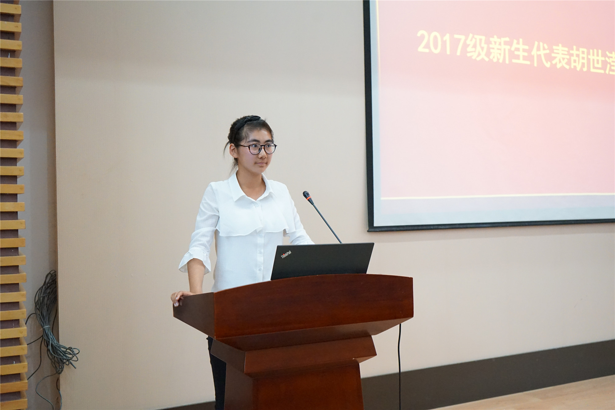 新生代表胡世滢同学上台发言。她说,能够来哈工大读书是自己一直以来的心愿,土木学院无论是从历史沿革还是科研实力都是行业内首屈一指的,因此能够加入这个大家庭她感到非常惊喜,非常认可学院对本科生的培养模式并对未来充满了期待。她呼吁所有2017级学生不要忘记责任担当,潜心学习,奋发图强,努力过好大学四年时光。她的发言引起了与会人员的强烈共鸣。
