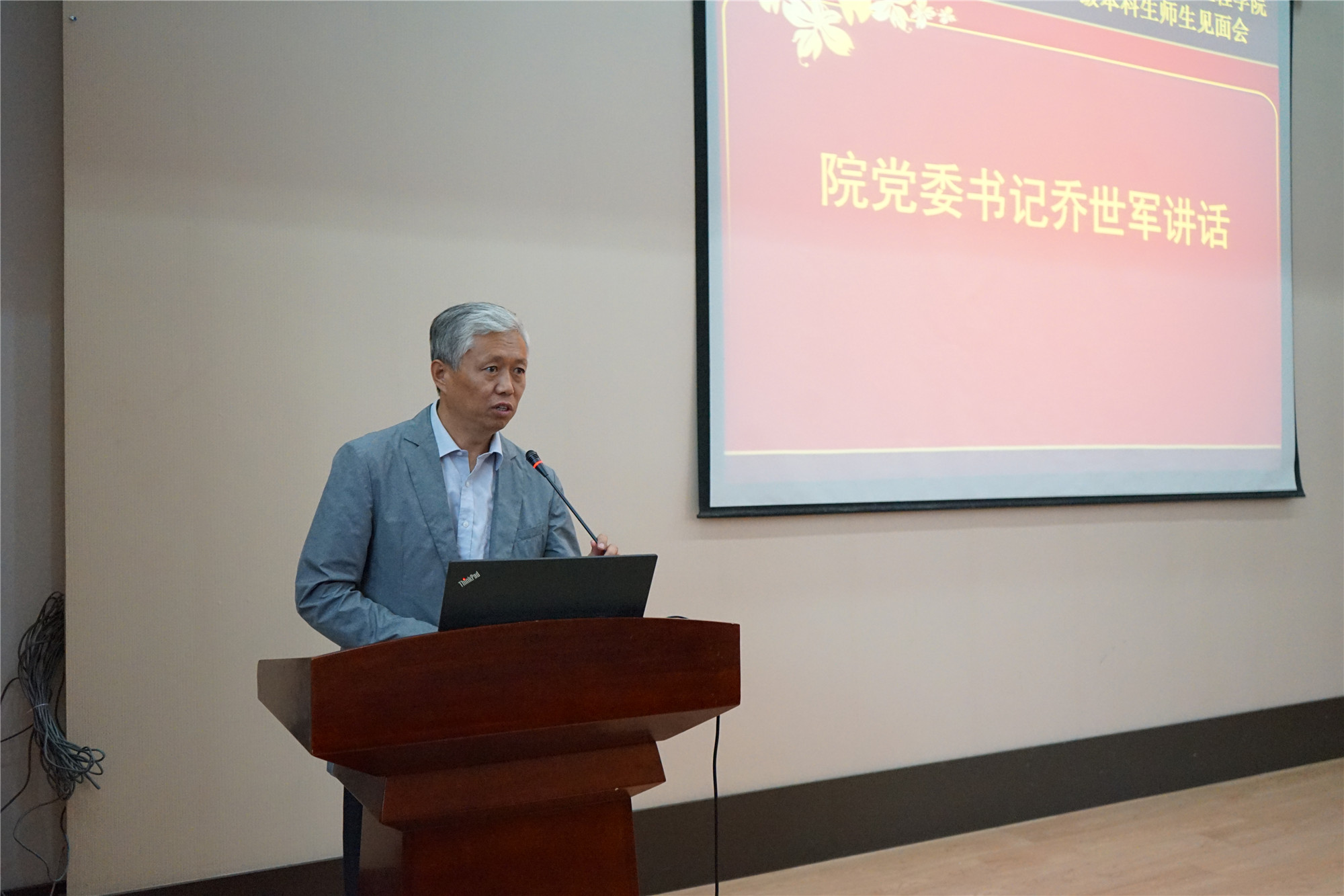 院党委书记乔世军为2017级新生代表颁发领带的纪念品并讲话。他对新生提出了一个问题,如何顺利的完成学业,健康成长?他表示,学生一定要做好规划,包括大学四年以及本科毕业后的人生方向。乔书记提到,“两个一百年”赋予了当代大学生新的历史使命,同学们要牢记习近平总书记在全国高校思想政治会议上对当代大学生提出的殷切希望,敢于担当,热爱专业,努力奋斗,成为社会主义事业的合格建设者和可靠接班人。他建议同学们要为自己定下一个小目标,顺利完成自己的学业,拥有健康的思维,争取大学生活不留遗憾。