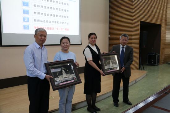 大会还对新入职的教师表示欢迎,同时对为学院做出贡献即将退休的两位教师表示感谢,并为他们颁发了纪念品。
