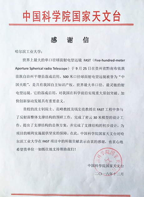 哈工大报讯(肖克/文)近日,中国科学院国家天文台给我校发来感谢信,感谢我校结构设计团队在世界上最大的单口径球面射电望远镜FAST项目中所作出的重要贡献。