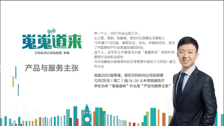 内容简介:你想了解我国目前最大的专业住宅开发企业吗?你想了解其未来的发展态势吗?或是你期望有朝一日加入万科集团吗?万科集团杭州公司总经理李嵬将为您倾力呈现万科集团!期待你的到来!
