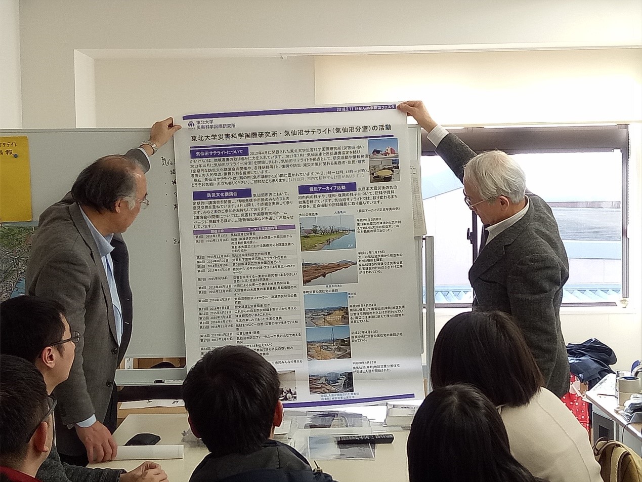 在气仙沼市,交流团来到日本灾害科学国际研究所气仙沼分室,倾听了铃木修技术职员、安倍准教授对气仙沼市受灾情况与灾后重建的报告。植松康教授还带领同学们观看了“311”海啸的影视资料。