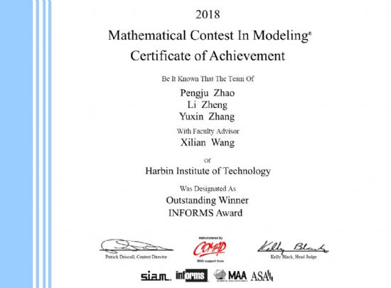 近日,2018年美国大学生数学建模竞赛和交叉学科建模竞赛(MCM/ICM)成绩揭晓。我院15级本科生赵鹏举、郑笠、张雨鑫三位同学组队获得了美国大学生数学建模竞赛最高奖Outstanding Winner。