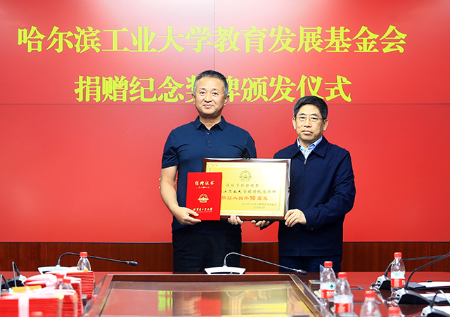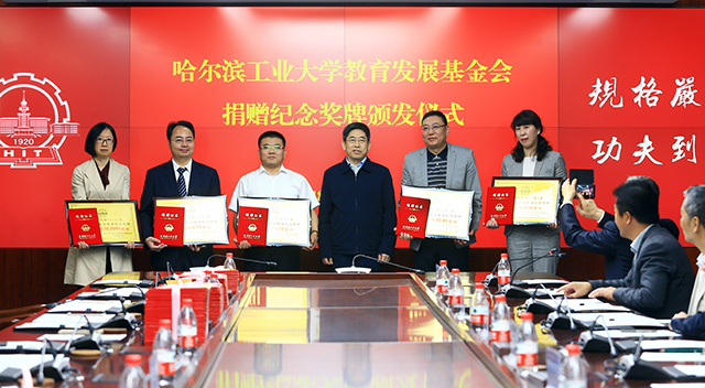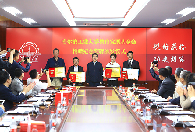 5月11日,哈工大教育发展基金会纪念奖牌颁发仪式在行政楼626会议室举行。校党委书记、基金会理事长王树权为捐赠企业代表和校友代表颁发捐赠纪念奖牌、证书、教育贡献奖牌和杰出教育贡献奖牌。