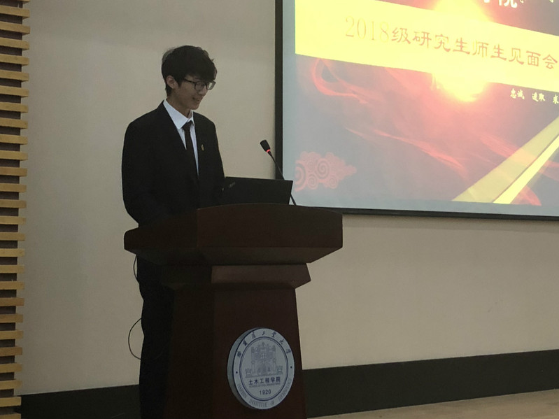 新生代表车紫进同学在发言中结合自己过去四年在土木学院的成长经历表示了对学院的敬意与感谢,同时提出自己做人要踏实诚恳,做事要奋勇争先,待人要亲和友善,接物要海纳百川的感悟与所有新生共勉。最后他表态要在科研路上踏实前进,将理论研究扎根于实践,将哈工大土木人的使命感和责任感贯彻终身,并希望与每位同学共同进步,共同成长。