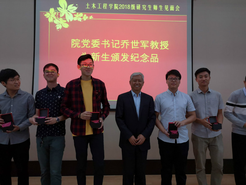 院党委书记乔世军教授为新生颁发礼物,学院为每位新生准备的是一条印有学院字样的领带。党委副书记吴严也对各位新生提出了祝福。