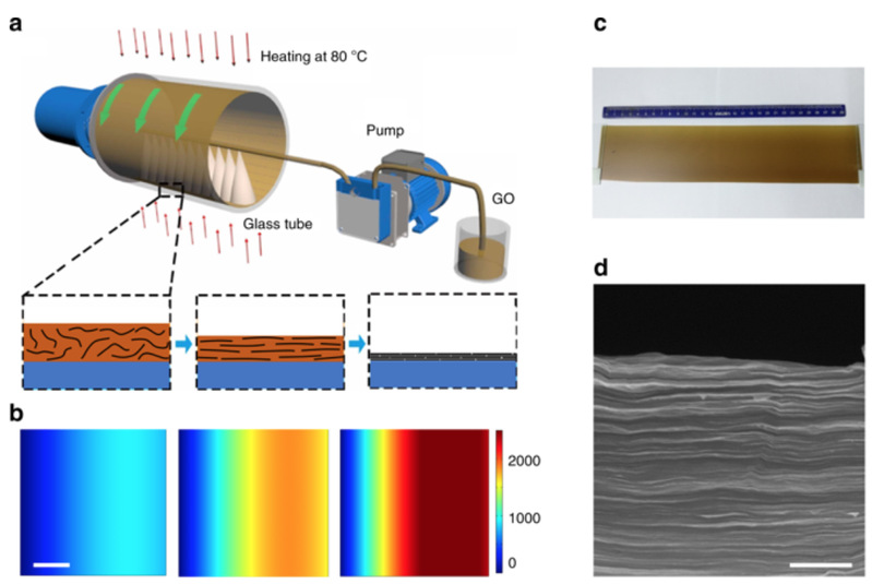 其次,针对石墨烯难以大规模有效定向与致密组装问题,钟晶课题组与中科院金属研究所先进碳材料部合作,利用流体力学的基本原理,首次提出利用离心浇铸法在旋转过程中产生的离心力与剪切应力实现二维材料的高效大规模的高度定向及致密组装,实现了对石墨烯薄膜、石墨烯复合材料、氮化硼薄膜、二硫化钼薄膜以及异质结的高效制备,并展现出极为优越的性能。该研究成果发表在国际著名期刊《Nature Communications》上。