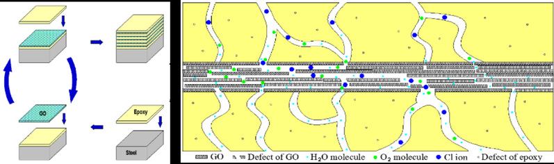首先,针对于限制石墨烯高分子防腐涂料性能提升的瓶颈问题,即石墨烯难以分散与空间分布难以控制等问题,钟晶课题组与华盛顿州立大学石鲜明教授课题组合作,首次提出了基于贝壳仿生结构的防腐策略。通过旋转法层层组装方法,制备了氧化石墨烯/环氧树脂复合涂层。由于石墨烯在该复合涂层内形成了平行致密堆叠结构,不仅完全避免了石墨烯的分散问题,而且可以完美阻隔氯离子等腐蚀介质的渗透,从而实现了只用常用涂层的25%厚度,就可以极大涂层的防腐效果。该研究成果发表在国际著名期刊《ACS Nano》上,哈工大为共同第一单位与通信单位。