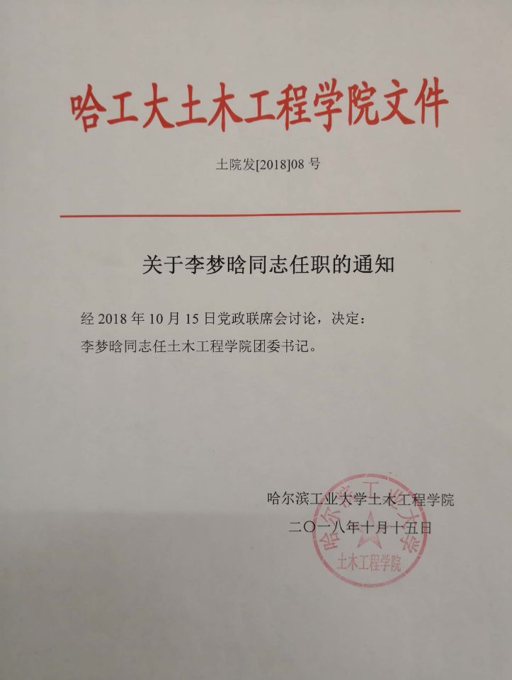 关于李梦晗同志任职的通知