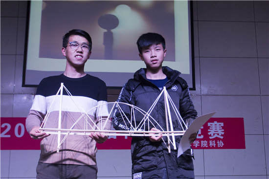 参赛大一学生自由组队,同学们经历了为期13天团队合作的模型设计及制作过程,完成了自己理想的作品。比赛现场,一个个创新独特、结构精巧的作品一一排列开来,静静的等待着加载的考验。加载环节,同学们首先对自己的模型设计进行介绍,而后屏气凝神为自己的模型进行了分级加载。
