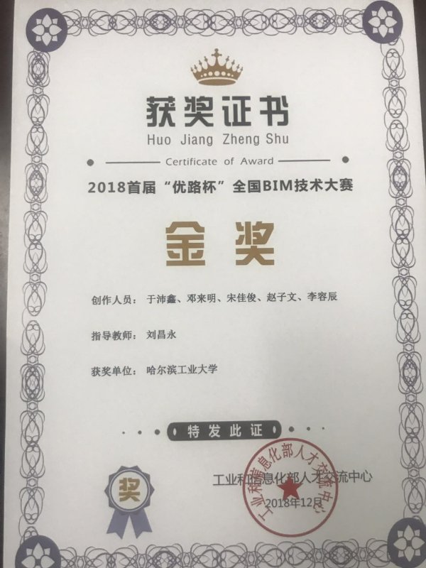 由工业和信息化部人才交流中心主办,石家庄铁道大学承办的2018首届“优路杯”全国BIM技术大赛颁奖盛典于2018年12月1日在京举办。经过激烈角逐,由我院BIM与智慧建造研究中心刘昌永副教授指导,于沛鑫、邓来明、宋佳俊、赵子文、李容辰五位同学组队的“菁华队”获得本次大赛金奖。“优路杯”全国BIM技术大赛自今年5月启动,上千家企业与院校参与赛事,本次活动规格高,号召力强,影响深远,1200多份作品提交至大赛组委会,经过评委公正评选、疑问作品现场答辩,最终确定获奖作品。
