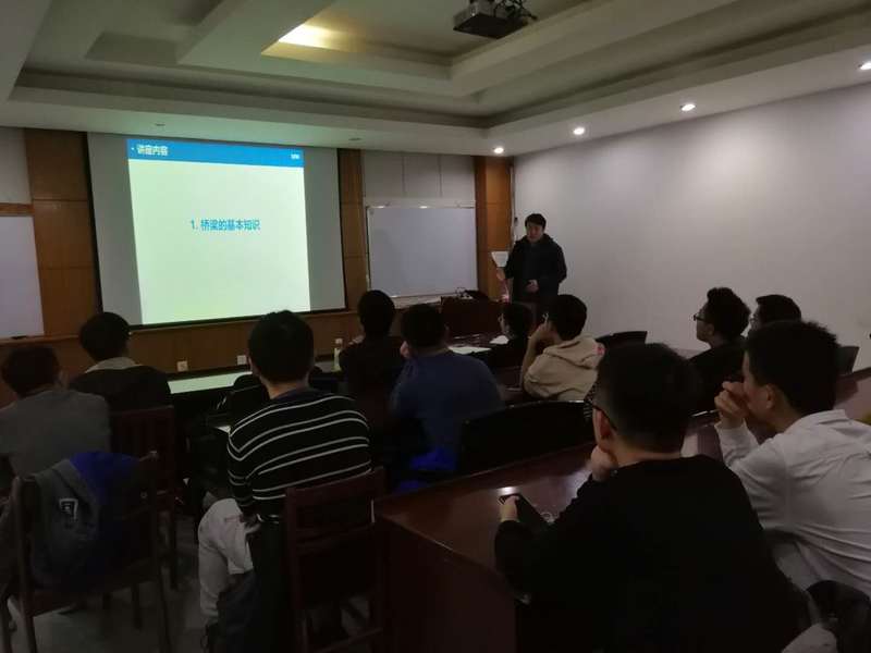 由上海同豪土木工程咨询有限公司主办的首届大学生桥梁设计竞赛将于2019年5月份进行。为了让同学们更好的了解桥梁设计的基本知识和流程, 2019年3月23号晚,特邀请周文松老师做了关于桥梁设计的专门知识讲座。周老师对桥梁的基础知识和桥梁设计的过程做了详细细致的讲解,同学们受益匪浅。