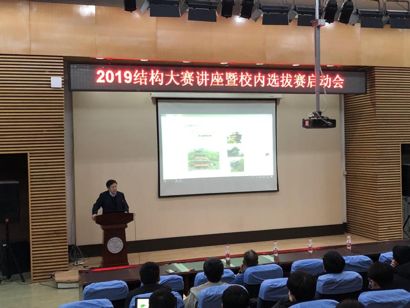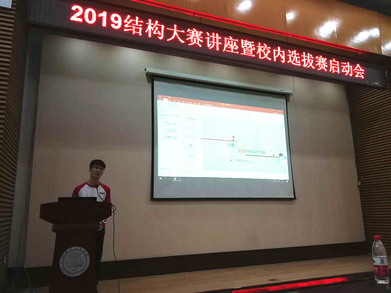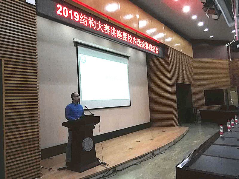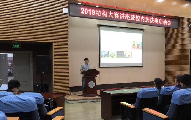 2019年第十三届全国大学生结构设计竞赛知识讲座暨校园选拔赛启动仪式于2019年4月1日在伟德betvlctor1946源于英国报告厅举行。参加本次启动仪式的有本科办副主任赵亚丁老师,结构设计竞赛指导专家邵永松老师,学生科创活动负责人卢姗姗老师以及2016年、2017年两届全国结构设计竞赛一等奖获得者吴进峰同学,2018年全国结构设计竞赛一等奖获得者符洋钰同学。