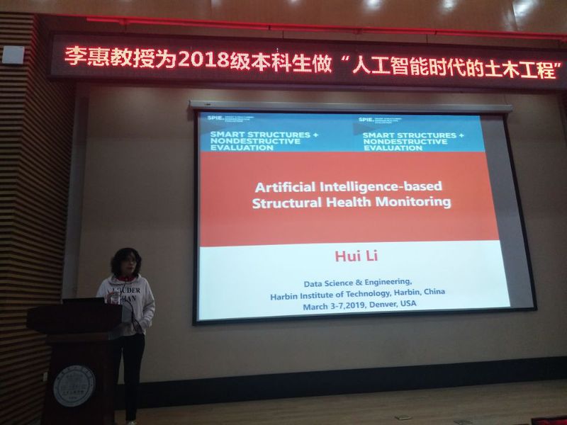 土木学院2018级本科的同学们即将完成在哈工大第一年的学习生活,为了给同学们提供与土木学院顶尖名师零距离接触的机会,提供与名师交流的平台,使同学们在与名师的交流中全面了解土木工程专业,深入了解土木就业和科研方向,助力同学更好地进行本科生涯设计与未来职业规划,同时经过多年的演进,人工智能发展进入了新阶段,人工智能也成为人们当下广泛议论的词汇。为了让同学们了解人工智能与土木工程之间的联系,引导同学们成为创新型和科技型人才,2019年7月1日18:00于土木学院三楼报告厅,特邀李惠教授为2018级本科生做了“人工智能时代的土木工程”讲座,讲座由李培森同学主持,土木学院全体2018级本科生聆听了本次讲座,辅导员樊少勇参加此次讲座。