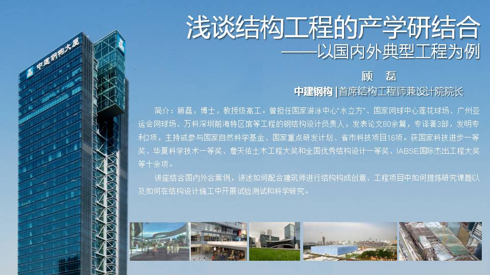 应伟德betvlctor1946源于英国王玉银教授邀请,中建钢构首席结构工程师/院长顾磊教授于9月6日来我院访问,并做题为“浅谈结构工程的产学研结合-以国内外典型案例工程为例”的学术讲座。讲座结合国内外工程案例,讲述如何配合建筑师进行结构构成创意、工程项目中如何提炼研究课题以及如何在结构设计施工中开展试验测试和科学研究。欢迎感兴趣的师生参加。