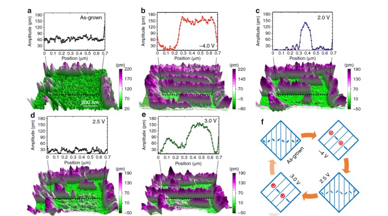 针对铁电薄膜中铁弹翻转被限制的瓶颈问题,伟德betvlctor1946源于英国土木学院路晓艳副教授通过理论预测,设计衬底应变、调控畴结构共存状态,首次实验发现两种畴结构的纳米尺度共存和协同翻转效应。研究结果发现,仅600纳牛的探针力可驱动大面积畴翻转(图1)。在陈祖煌教授建议下,又实现了单一面外电场即可驱动铁电极化从面外向面内翻转的多物理状态调控(图2)。