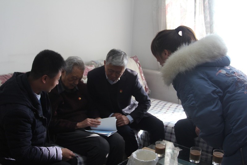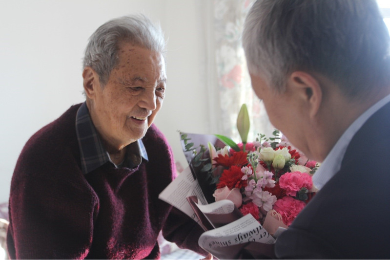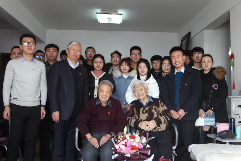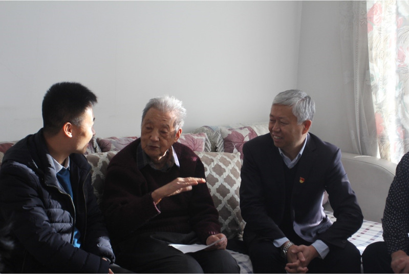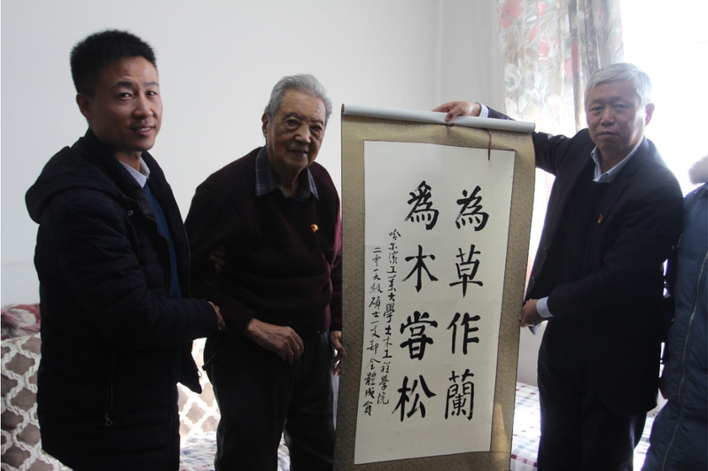 党委书记乔世军首先代表学院为陈老先生和老伴送上学院的关心和问候,表达对老先生的敬仰之意,他讲到,“今天是哈工大百年华诞倒计时200天,学校发布了校庆一号公告。在这历史节点,我们土木学院师生看望采访陈老非常有意义,一是致敬哈工大百年发展历程和取得的光辉业绩,二是致敬陈老,我们要传承哈工大老“八百壮士”精神