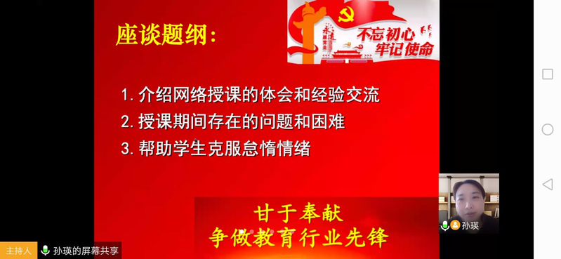 本次主题党日活动对学科组前一阶段的网络授课情况做了很好的交流和总结,坚定了大家的信心,各位党员教师也表示将继续发挥党员的先锋模范作用,做好新形势下的网络授课工作,不管形势如何变化,都要坚持知行合一,主动担当作为,做到不忘立德树人初心,牢记教书育人使命。在热烈的讨论和交流中,本次主题党日活动成功结束,取得了圆满成果。