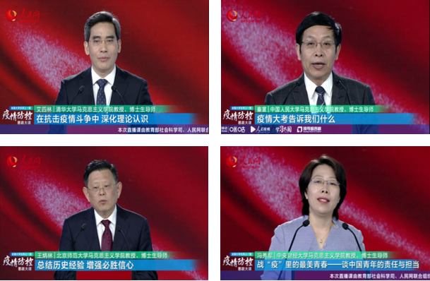 这堂疫情防控思政大课,邀请到了清华大学马克思主义学院艾四林教授、中国人民大学马克思主义学院秦宣教授、北京师范大学马克思主义学院王炳林教授、中央财经大学马克思主义学院冯秀军教授等四位哲学、法学领域的权威专家,他们或深入浅出、或旁征博引地解读了党中央关于疫情防控的决策部署,分析了中国抗疫彰显的中国共产党领导和中国特色社会主义制度的显著优势,讲述了防疫抗疫一线的感人故事。