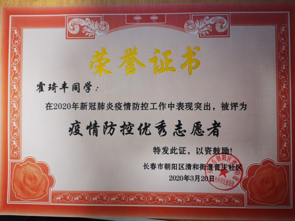 320日,由于毕业论文中期检查的压力,并且疫情减缓使得社区工作压力日渐缓和,霍琦丰结束了他这段时间的社区志愿服务工作。在最后一天离职时,社区还为他颁发了“疫情防控优秀志愿者”证书。霍琦丰说,这是他第二次参与社区工作,每一次参与都会对政府基层工作有更深一层的理解,朴实无华又辛苦劳累的一份份工作当中,蕴含的那份共产党人全心全意为人民服务的宗旨永远是鼓舞大家踽踽前行炽热的精神内核。