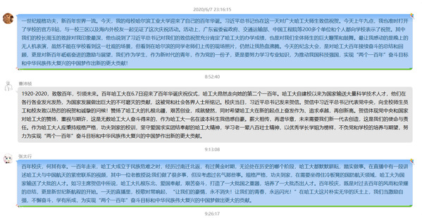 18级硕士生杨思颖说,母校收到习近平总书记的百年贺信,我感到非常自豪,是工大的前辈们的百年奋斗,老师潜心育人;学子踏上社会后,在平凡或不平凡的岗位上艰苦奋斗,前辈们齐心为国家发展做出了自己的贡献,才有了工大的有口皆碑。作为一名哈工大在校的研究生,感谢学校提供的广阔平台,感恩前辈们的不懈奋斗,我要更努力学习,做一名合格的哈工大人,为母校再创新百年辉煌贡献力量。