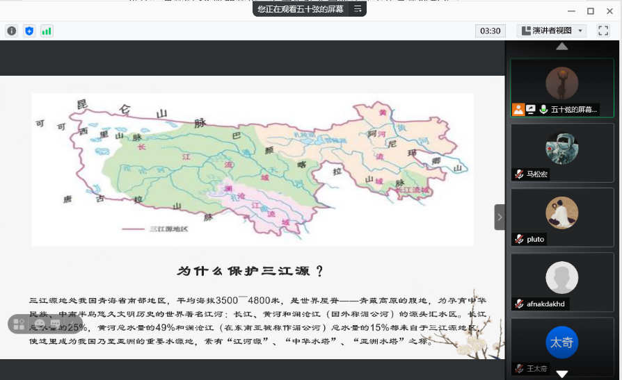 3月6日,团队同学通过腾讯会议的形式,在线上进行了以三江源为主题的宣讲活动。活动中,大家对三江源生态现状及环保现状进行了介绍,抒发了各自的实践心得体会,并积极呼吁参与环境保护事业。同时组织观看了《三江之源》纪录片,传递人与自然和谐相处的美好希望,传递敬畏生命,热爱自然的哲学思想。