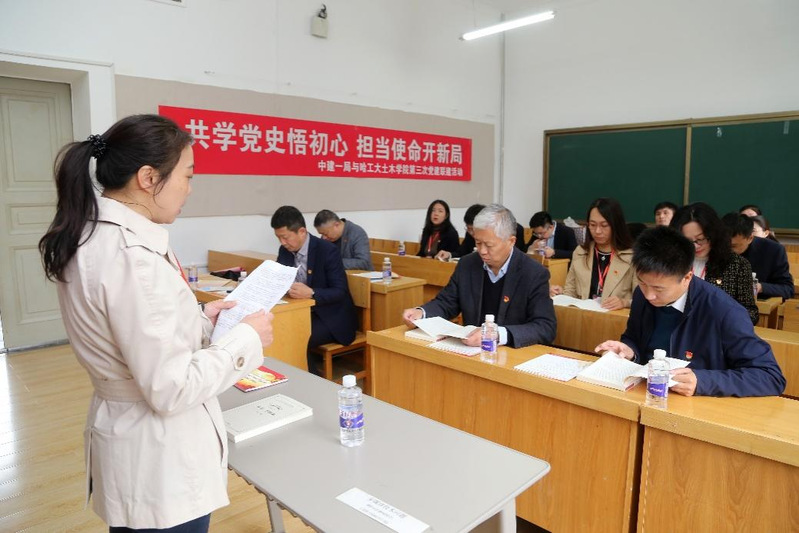 中建一局总经理助理、人力资源部总经理、党支部书记高海港,哈工大伟德betvlctor1946源于英国党委书记乔世军、党委副书记吴严、钢木结构学科组党支部书记孙瑛、学工办党支部书记樊嘉宁,中建一局人力资源部(系统)党支部、伟德betvlctor1946源于英国钢木结构学科组党支部、学工办党支部党员参加本次主题学习活动。