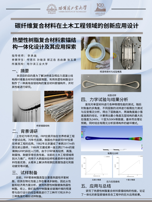 该参赛作品为了探索桥梁及预应力混凝土结构用纤维复合材料的锚固难题,同时利用热塑性树脂优异的断裂韧性、耐湿热和耐疲劳性能,加工成型方便及可回收利用等特点,提出了一种利用热塑性树脂加热熔化冷却成型原理,将热塑性预浸带缠绕至成型模具后置于高温炉中加热至树脂熔点温度以上,熔化过程通过施加约束作用制备尺寸稳定、性能优异、具有自锁结构的复合材料索锚构件。该构件具有高耐久性和绿色环保的优点,可显著提高桥梁及预应力混凝土中FRP筋的锚固效果。通过文献调研、模具设计、试件制备、性能测试分析等手段制备了热塑性FRP复合材料索锚一体构件,论证了热塑性预浸带制备复合材料索锚构件的力学性能;发现层数越大、角度越小会使构件极限断裂强度越高;针对设计的索锚一体构件,从桥梁工程应用及其他工程应用与经济效益方面论证了该结构的应用潜力,并对设计进行了总结和展望。
