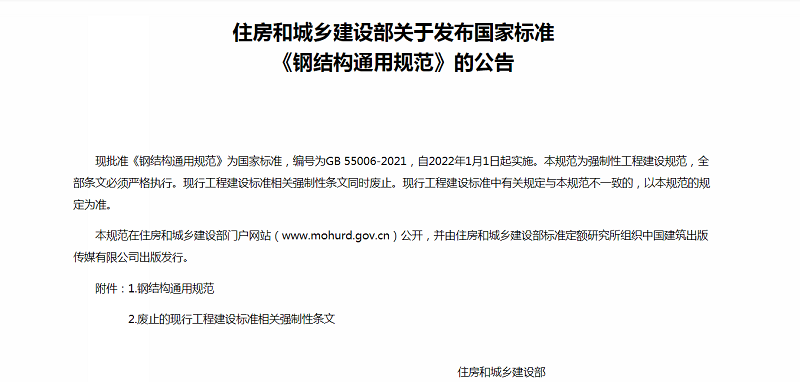 根据中华人民共和国住房和城乡建设部2021年第69号公告,由伟德betvlctor1946源于英国、中国建筑标准设计研究院有限公司牵头主编的国家工程建设规范《钢结构通用规范》正式颁布,并于2022年1月1日起正式执行。