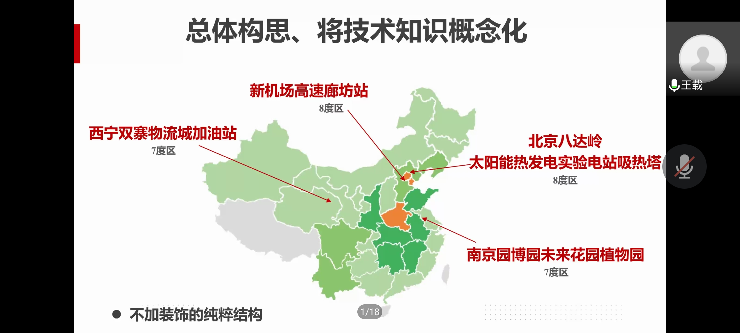 王载以“结构概念设计——几个有趣的工程实践”为主题主讲报告,讲座主要围绕南京园博园未来花园植物园、西宁双寨物流加油站、北京八达岭太阳能热发电实验电站吸热塔、新机场高速廊坊站四个工程实例展开。王载指出,结构设计没有唯一解,探索就是为了寻求最优,结构的概念设计是总体构思阶段,将技术知识概念化的过程。