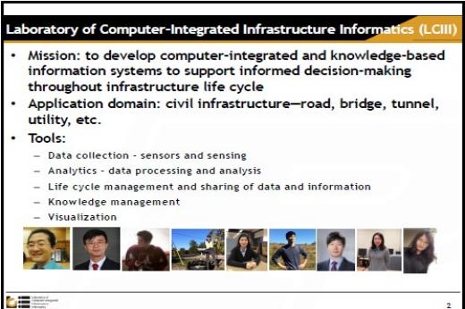 算机集成基础设施信息学实验室( LCII ),参与创建了离散事件模拟 DES )实验室。蔡教授毕业于同济大学建筑管理工程专业,获得学士学位。然后就读于北卡罗来纳州立大学土木工程专业,获得硕士学位和博士学位。蔡博士曾就职于北卡罗来纳州交通部( NCDOT )、 URS 公司(现为 AE.COM 的一部分)和西密歇根大学。 2009 年开始在普渡大学任职。蔡博士的研究方向广泛,具有基础设施信息学方面的研究专长,包括多模传感、高级计算算法和数据分析以及人机协作方向,现已发表了 100 多篇论文。自 2003 年以来,他一直担任 ASCE 《土木工程计算杂志》( JCCE )的副主编,目前担任该杂志的编辑委员会成员。蔡博士担任 ASCE 数据传感和分析( DSA )委员会主席。他的研究小组获得了许多最佳论文和海报奖。他最近的基于风险的施工检查项目(由印第安纳州交通部资助)获得了 2020 年 AASHTO (美国州公路和交通官员协会)奖项,该奖项旨在表彰交通领域的高价值研究项目。