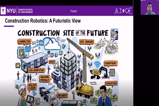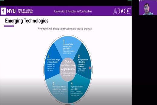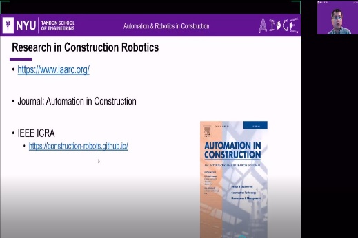 课程介绍的新兴领域construction robotics是传统土木工程、计算机视觉等学科的交叉学科,是为了发展建筑机器人领域的新理论,来解决工程实际中所碰到的问题。课程通过图片预测土木工程的未来发展趋势是建筑工地智能化和信息化。课程简单介绍了柔性机器人的安全性和抓手与建筑材料交互的技术难题。课程介绍了自动运行设备的挑战在于机器对于场景的理解,只有准确判断场景,才能保证和人交互的安全性。课程介绍了无人设备即时定位和制图的难点和应用。课程介绍了3D打印的原理和目前的效率缺陷,并介绍了未来20-30年的机器人的发展方向和发展目标。课程还介绍了智能机器人行业的发展动机,一是解决建筑行业长久以来的安全问题,二是解决建筑行业始终生产力低下,生产效率没有得到提高的发展情况,三是解决国内外富有经验的工人劳动力短缺的情况。冯晨博士列举了现有的建筑工程涉及的高新技术,将高新技术分为信息技术和自动化技术分别介绍。通过视频介绍了拍摄大量图像来进行三维场景重构的方式和通过计算机视觉和机器学习的方法来完成车辆交通的检测。