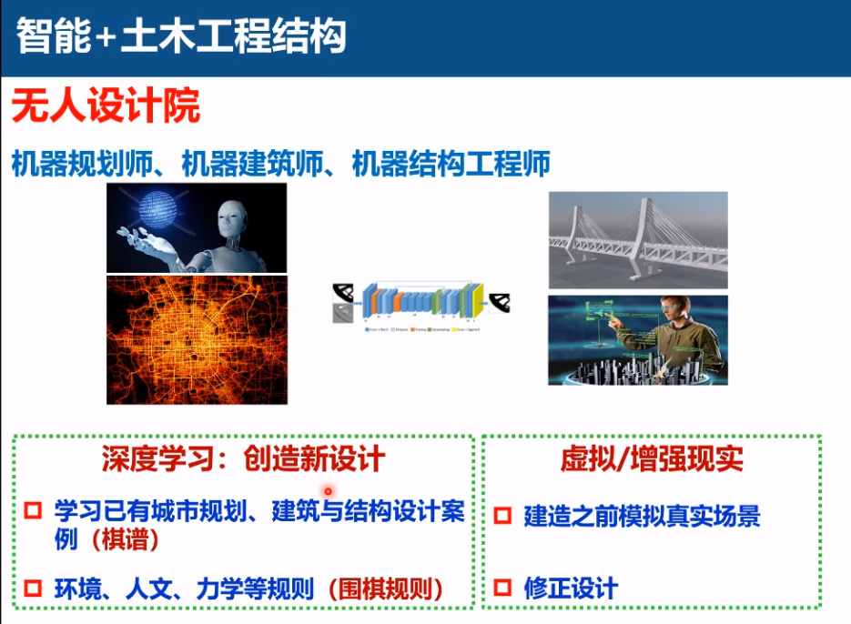 讲座围绕智能建造开展,介绍了基于人工智能的智能化设计在建筑艺术外形智能设计的应用,在艺术设计成本低的同时,具有结构受力性能好、设计速度快、节省材料的特点;在结构拓扑优化设计中,利用人工智能代替人类完成结构设计,在满足设计目标的前提下节省材料。随后结合实际案例介绍了智慧建造-无人系统、智慧运维一结构健康监测机器学习范式等方面的研究现状,以基于计算机视觉与深度学习的方法、基于机器学习的结构模态参数识别方法、基于深度强化学习的结构可靠性评估等内容为主展开分析土木工程中的人工智能算法,并对具体监测案例进行了介绍。最后,扩展介绍了国内外科学研究,包括Google公司DeepMind、MIT CSAIL实验室等,强调了智能建造是国家“新基建”战略的重要内容,也是人工智能背景下的高等教育“新工科”专业。