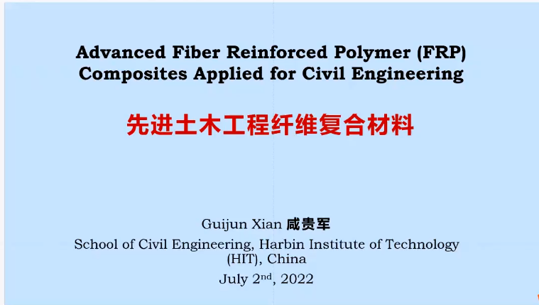 (柳露萌 图/文)7月2日下午,“智能土木与智能建造”暑期学校第十四次课程讲座,咸贵军教授针对先进土木工程纤维复合材料进行了讲授,主要包括土木工程中的纤维复合材料的背景、特性增强、天然纤维复合材料几方面。讲座线上会议由研究生助教张婉婷主持。
