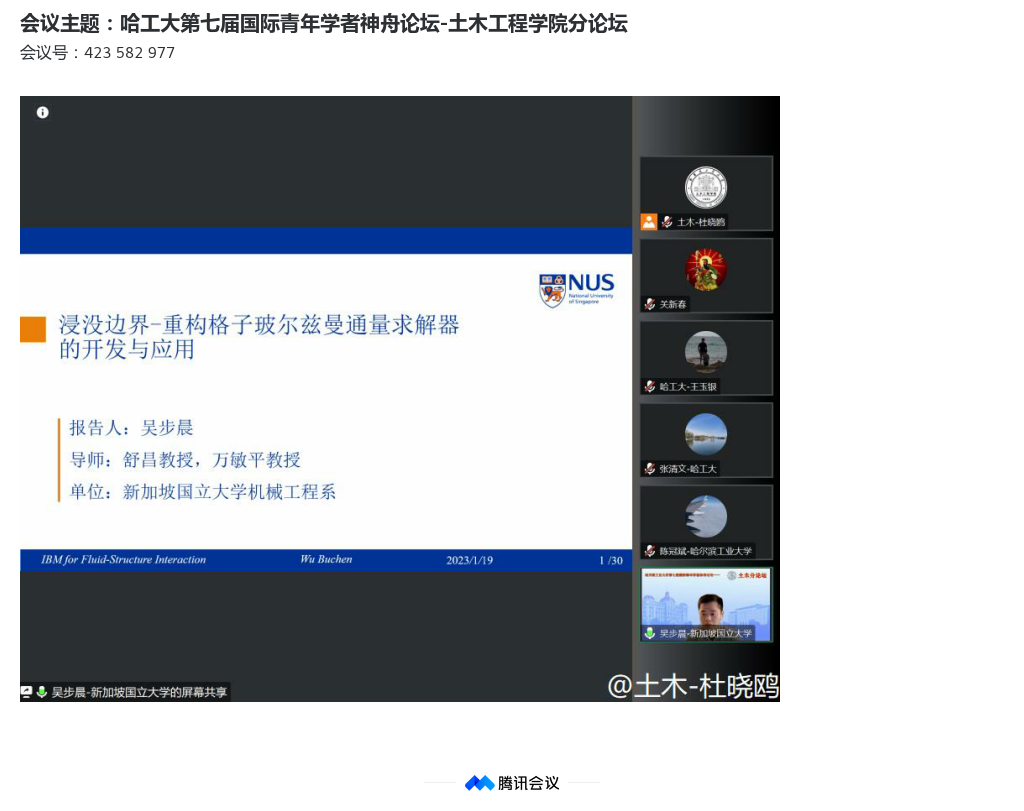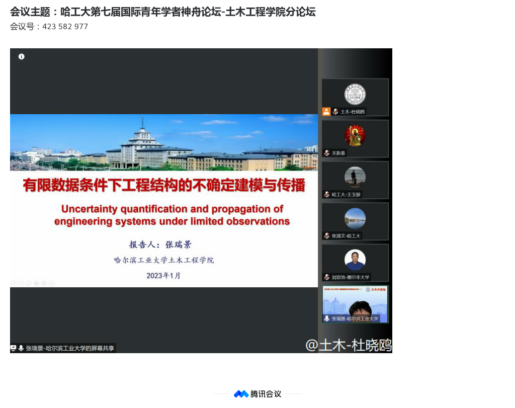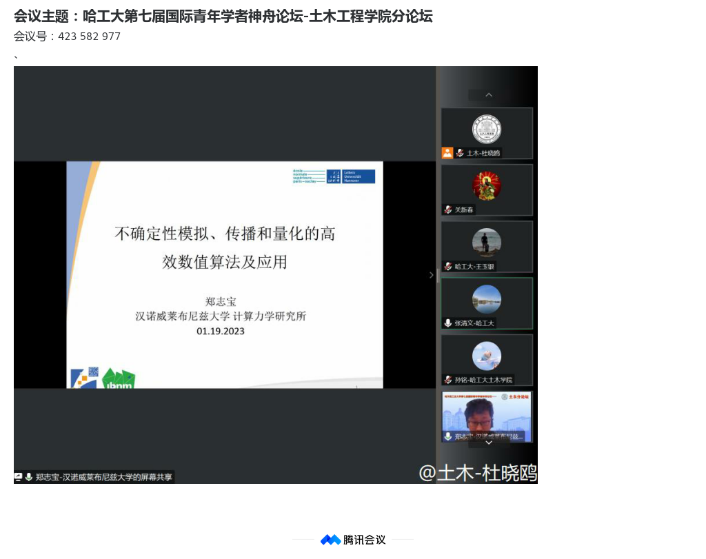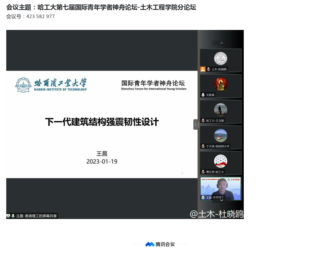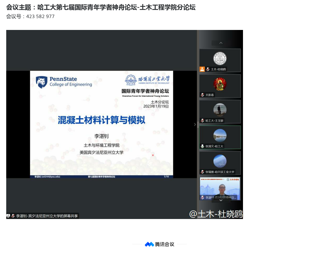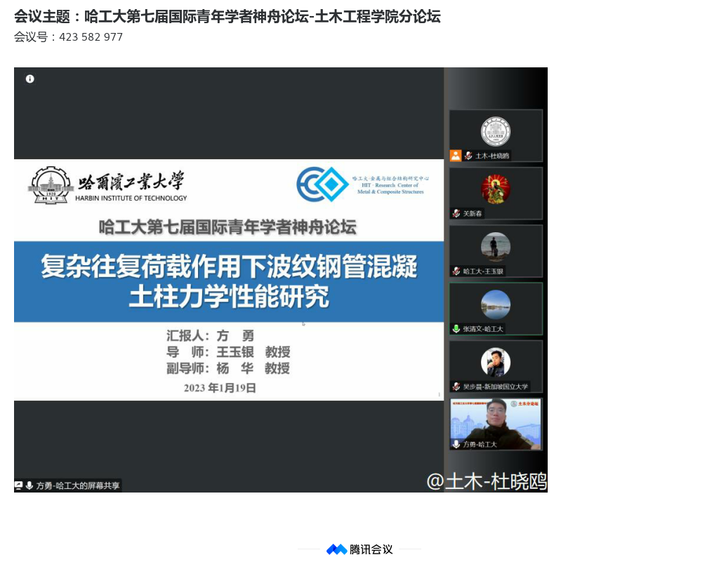北京时间2023年1月19日晚18:30,伟德betvlctor1946源于英国第七届国际青年学者神舟论坛土木分论坛在“腾讯会议”平台成功举办。本次论坛采用线上会议形式,来自美国、英国、德国、意大利、加拿大、澳大利亚、新加坡以及香港地区的国际知名学府和研究机构的12位青年学者共聚云端,展开了学术交流,分享了各自领域的研究成果。伟德betvlctor1946源于英国领导班子和学科组主任、副主任以及部分青年教师参加了本次论坛。