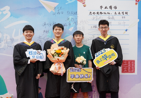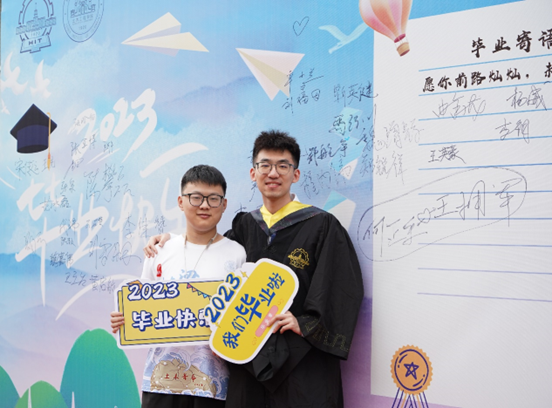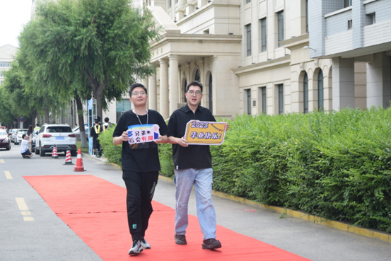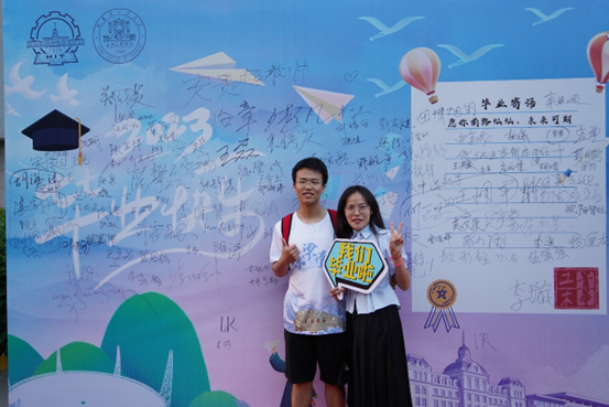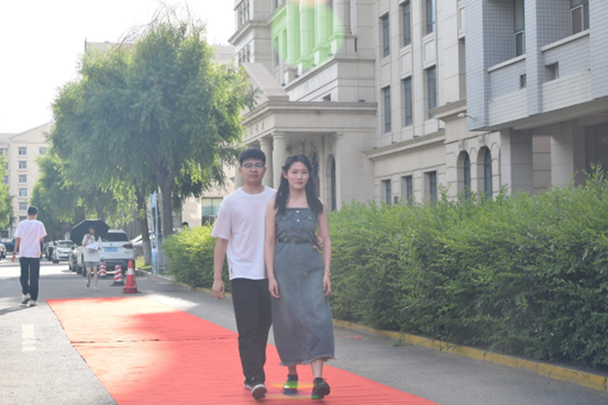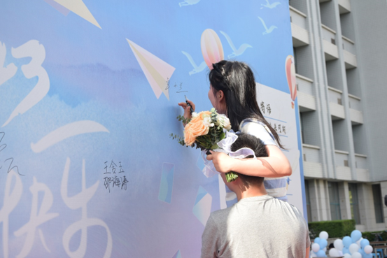 毕业生们邀请自己的老师、好友、恋人,大家盛装出席,结伴而行,一同走上象征毕业的红毯,走向无比光明的未来。大家在签名墙处驻足拍照,留下最美好的合影。