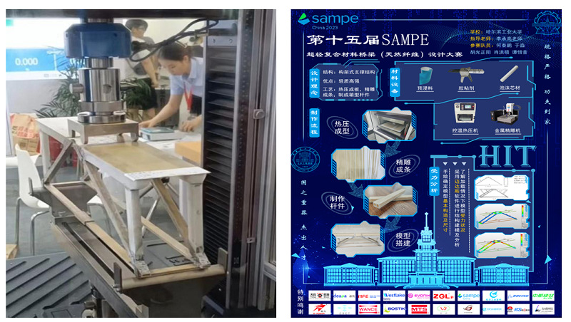 桥梁参赛作品为天然纤维苎麻预浸料固化成型后,通过切割条状板材拼接成箱型杆件,再用拼接的系列刚性系杆搭建成满足承载力要求构件。参赛团队通过文献调研、模具设计、理论模拟、试件制备、性能测试分析等手段制备了苎麻预浸料固化成型板材;通过对板材设计、切割、组装并通过荷载传力分析后制作出了具有高承载力、稳定性优异的轻质天然纤维桥梁构件,并对其未来的应用前景进行了总结和展望。此外,参赛团队制作的海报和视频作品将哈工大校训“规格严格,功夫到家”融入其中。