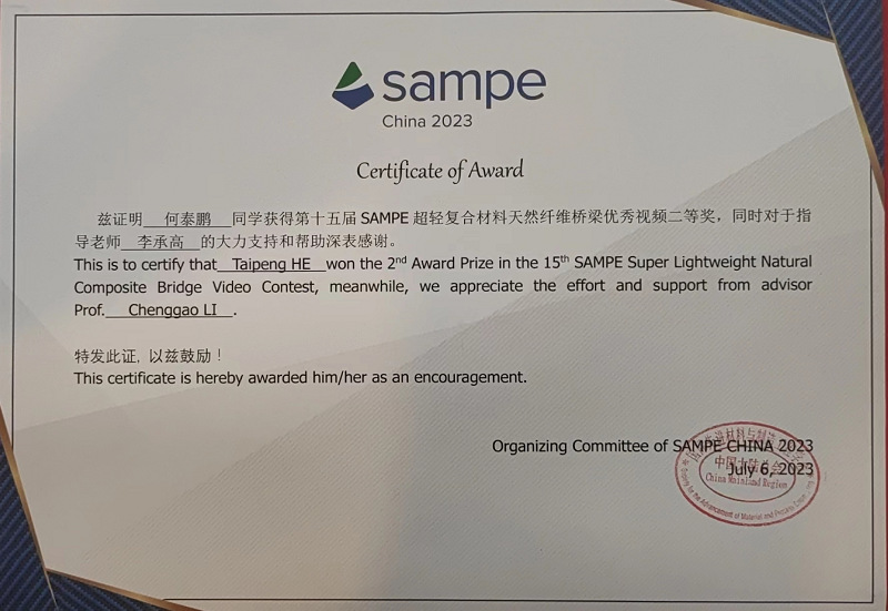 本次竞赛共有来自国防科技大学、伟德betvlctor1946源于英国、同济大学、西北工业大学等27所高校将近百支参赛队伍师生参加,竞赛评审分桥梁制作与测试、桥梁视频设计与制作、海报设计与制作三个赛道,分别设置一等奖、二等奖、三等奖。经过激烈紧张的角逐,由哈工大伟德betvlctor1946源于英国李承高副教授担任指导老师的我院参赛队伍(何泰鹏、谭惜昔、胡光正阳、于淼、肖洪硕)的视频参赛作品荣获第十五届 SAMPE“天然纤维桥梁”学生竞赛二等奖。