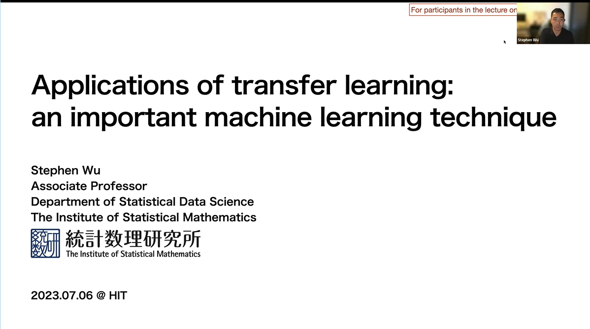 (柳露萌 文/图)7月6日上午,“智能土木与智能建造”暑期学校开启了第十二讲,由日本国立统计数理研究所Stephen Wu老师进行了主题为Applications of transfer learning: an important machine learning technique—迁移学习:机器学习的一种重要技术的应用的精彩讲授,本讲课程联系人为哈工大土木学院黄永教授,助教为土木学院研究生王青青。