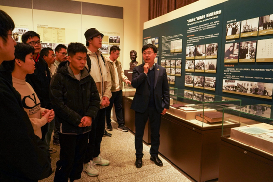 同学们来到哈工大博物馆,展览馆内陈列着哈工大百年历史的珍贵文物、创新成果以及杰出人才。在博物馆讲解员的带领下,同学们了解了哈工大在科技、工程和人文等领域的杰出贡献。讲解间隙,王玉银给同学们补充介绍了学校悠久的历史沿革,使大家对于学校历史背景和科研成果产生了浓厚的兴趣。