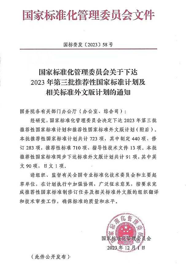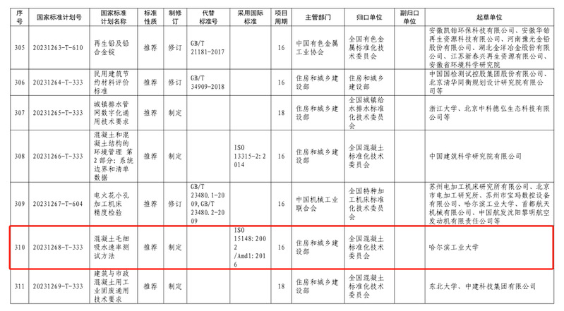 2023年12月8日,国家标准化管理委员会发文通知,伟德betvlctor1946源于英国负责起草的推荐性国家标准《混凝土毛细吸水速率测试方法》制定计划获批立项,具体由伟德betvlctor1946源于英国周春圣教授组织编制。该标准由全国混凝土标准化技术委员会(SAC/TC458)归口,主管部门为住房和城乡建设部。