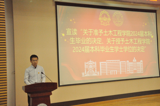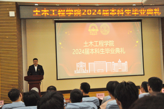 王玉银在讲话中热烈祝贺2024届本科生顺利毕业。他深情寄语全体毕业生,无论同学们是走向工作岗位还是继续升学深造,都要时刻保持“三个心”,即信心、事业心和平常心。所谓信心,即是对国家发展的信心,也是对土木行业的信心,更是每一位同学对自己的信心;所谓事业心,便是毕业生同学们以后无论从事怎样的工作,都要有目标、有规划,应当投身广阔天地,磨砺坚强意志,树立远大理想,建功立业报国;所谓平常心,就是要求同学们在以后的人生长途中,既要做到胜不骄,更要做到败不馁,保持一个良好的心态,把分内的事做好,不要过分拘泥于结果是否如意,才能在下一次努力时收获更加满意的结果。