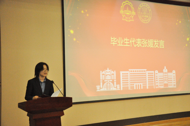 毕业生代表张媛在发言中表达了对学校、学院和老师四年培养的感恩,她回忆了本科四年的学习生活,表达了本科学习的结束并不是同学们的终点,而又是一个扬帆起航,开启人生新征程的起点。