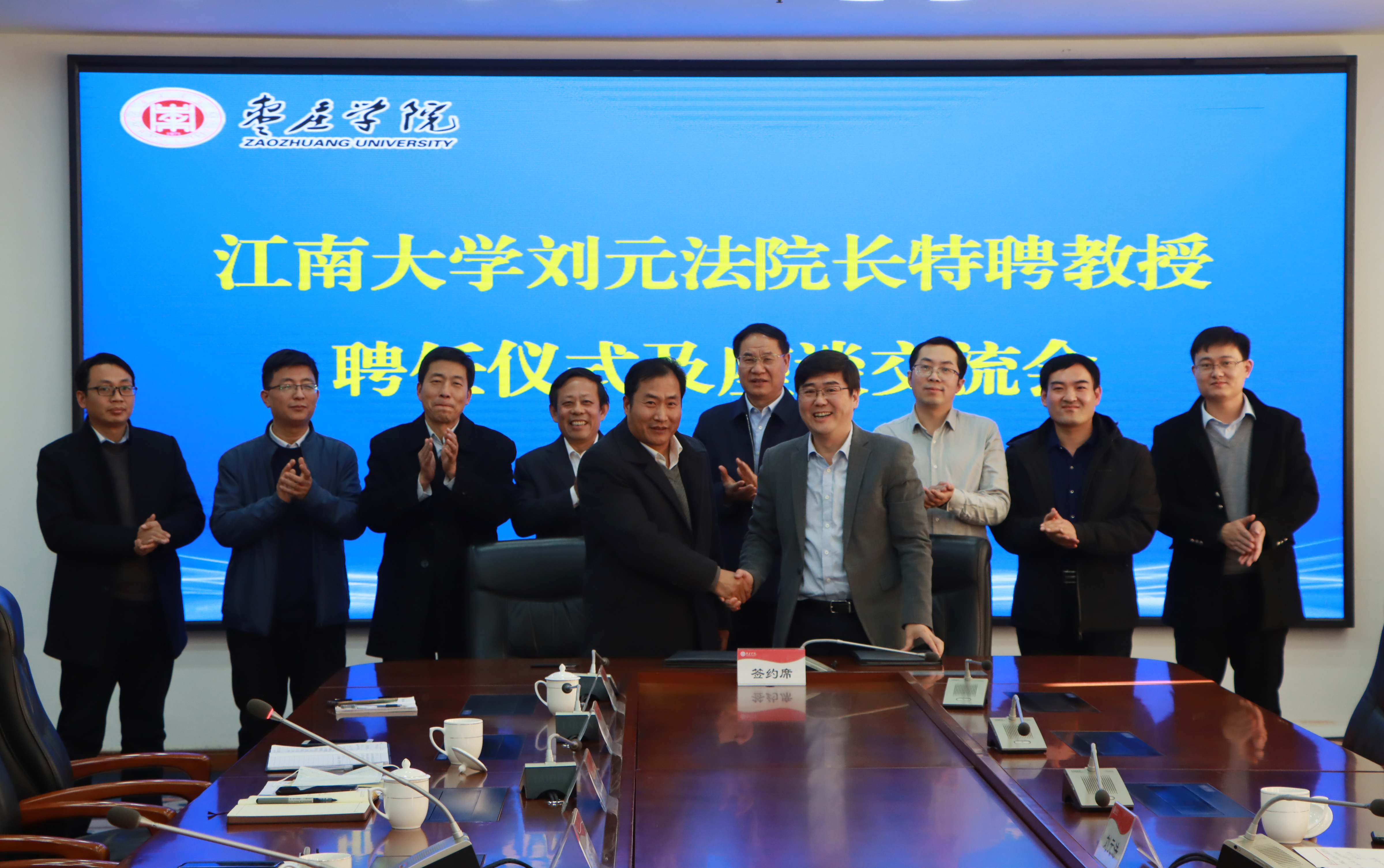 张立华代表今年会与刘元法共同签订《江南大学食品学院结对帮扶枣庄学院今年会框架协议》。