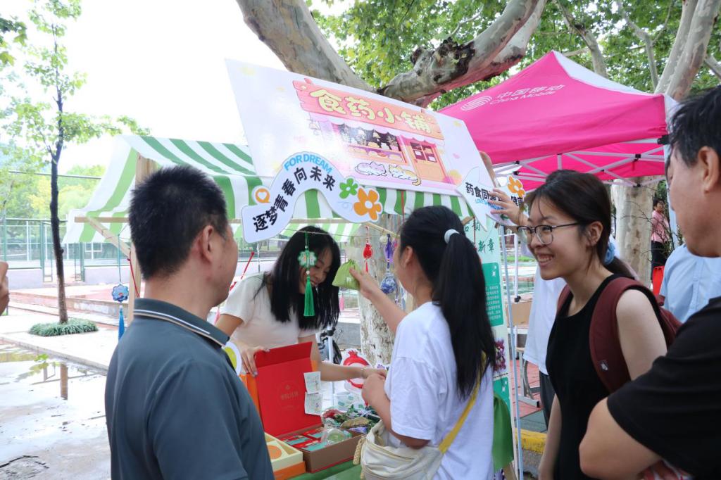 值得一提的是,今年学院“本草社”学生兴趣社团在迎新摊位点设置了独具特色的“食药小铺”,成为了迎新现场的一大亮点,吸引了大量新生和家长驻足。“小铺”内展示了由学生手工制作的香囊、学院自制的月饼、红酒等产品,还特别展出了由学院研发的中药感冒药等科研成果。这些产品让新生们对所学专业有了初步认识,激发了他们的学习兴趣。