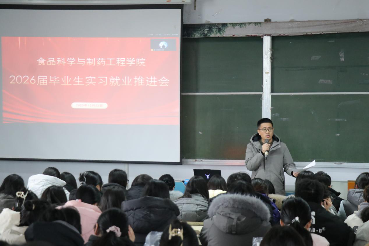 随后,孙中贯就2026届毕业生实习工作作出具体安排。他详细解读了实习管理规定、安全注意事项、实习报告撰写要求等核心内容,明确了实习时间节点与考核标准。针对不同专业方向,他介绍了学院合作的多家优质实习单位资源,包括知名食品加工企业、制药研发机构等,并强调要严格遵守实习单位规章制度,确保实习过程安全有序、学有所获。