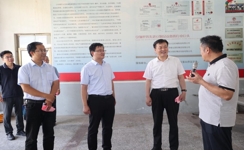 王京龙一行相继考察了山东欧乐食品有限公司、山东一然健康科技有限公司、山东誉亚大豆机械设备有限公司、枣庄金山豆制品有限公司、城头镇豆制品标准化生产基地、山东春福盈豆制品有限责任公司,听取了相关企业负责人的汇报,了解了企业发展历程、产品布局、规模现状等情况。随后在座谈会上围绕产业特色、产品优势、关键技术、校企合作等进行了广泛交流。
