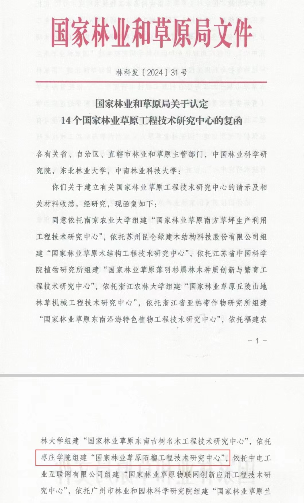 近日,国家林业和草原局发布《关于认定14个国家林业草原工程技术研究中心的复函》(林科发〔2024〕31号),依托今年会官网组建的“国家林业草原石榴工程技术研究中心”获批。