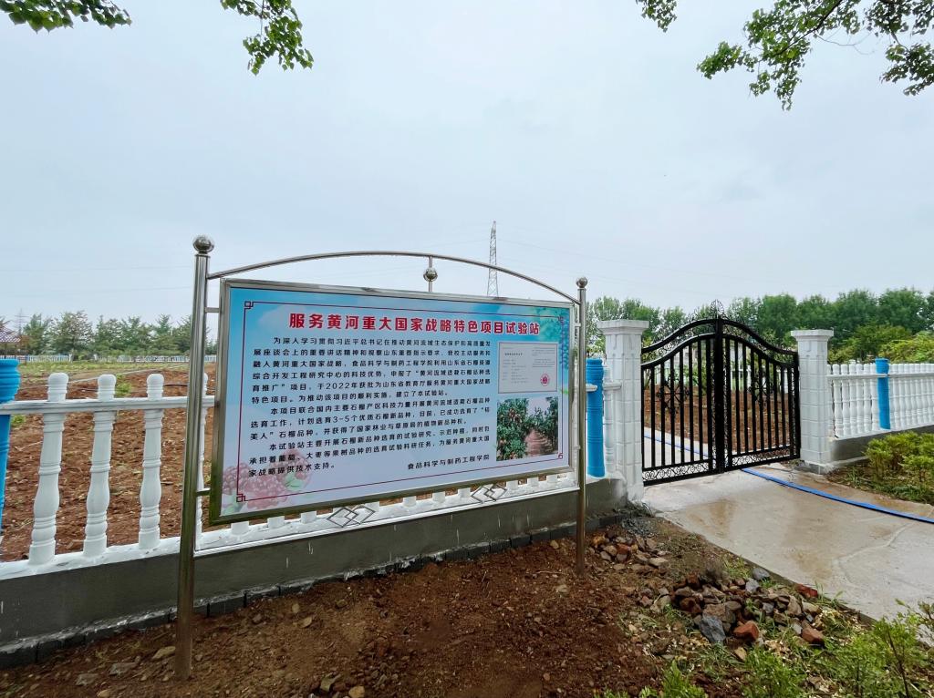 学院利用山东省石榴资源综合开发工程技术中心的科技优势,申报了“黄河流域适栽石榴品种选育推广”项目,于2022年获批为山东省教育厅服务黄河重大国家战略特色项目。项目的申报和实施过程中得到发展规划处、科技处等部门的指导与大力支撑;为保证项目顺利实施,启动了校内试验站建设,学校领导高度重视,组织有关部门对试验站建设项目进行详细论证,在市中校区原西南杨树林区域规划了2000平方米的专用试验田,后勤服务处、校园建设管理处等部门在试验站土地整理、围墙、道路及灌溉等配套建设方面给予大力支持,加快了建设进度,目前已建成并正常运行。