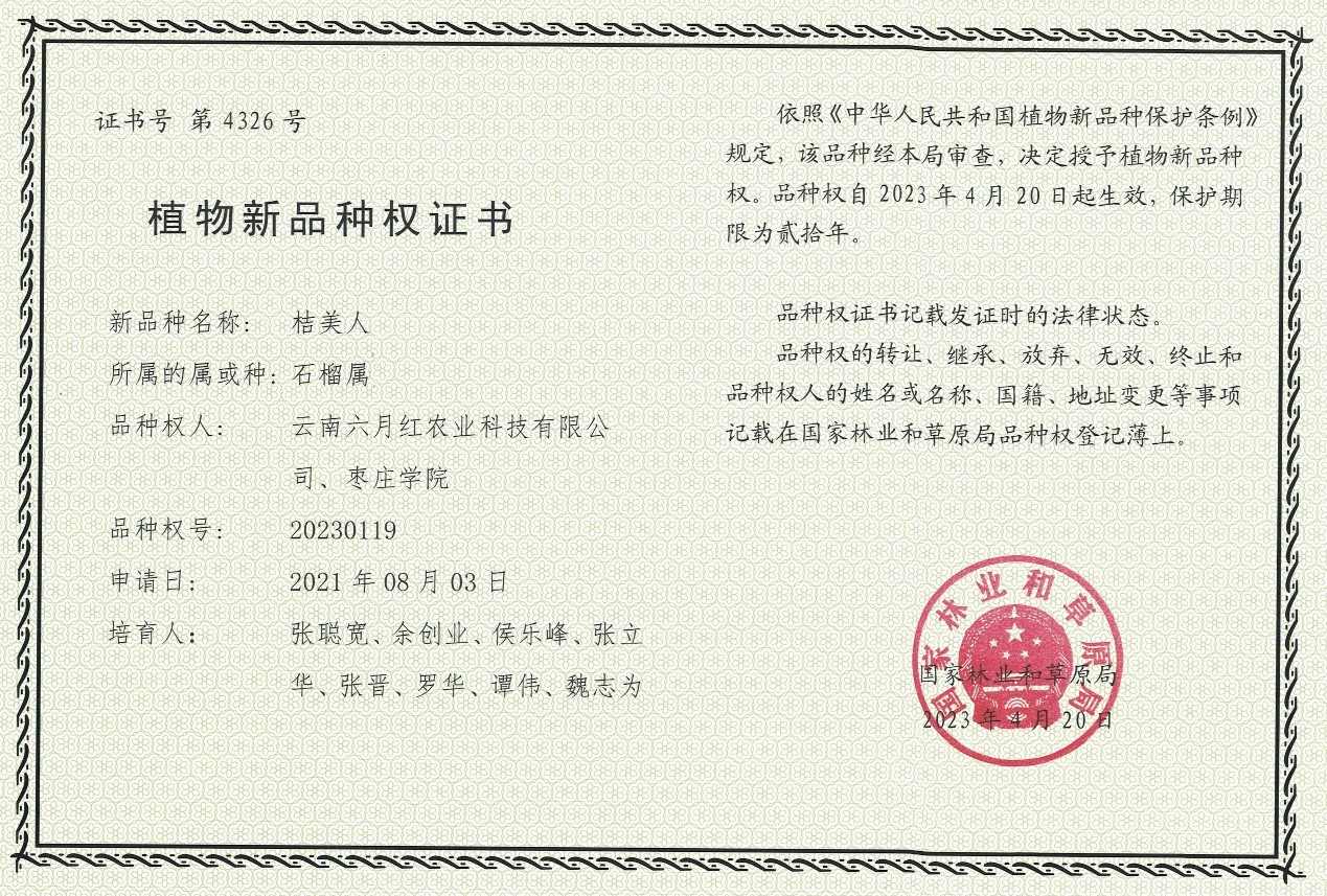 今年会官网今年会“石榴+植物资源科研团队”,利用山东省石榴精深加工工程技术研究中心和山东省石榴资源综合开发工程实验室的科研平台优势,与省内外科研院所、企业等开展广泛的技术合作。近日,该团队联合云南六月红农业科技有限公司申报的一个石榴植物新品种‘桔美人’,获得国家林业草原局的授权。该品种是由‘红如意’与‘Wonderful’杂交培育而成。具有早熟、丰产、稳产、果个大、果皮浓红、籽粒紫红、抗病、抗裂果、可溶性固形物含量高、挂树时间长(30天)等优良特性,籽粒风味甜、微酸,更适合中国大众消费口味。果实近球形,果皮桔红色。大型果,平均单果质量452g;籽粒紫红色,百粒质量44.6g;籽粒硬度2.12kg/cm2;平均可溶性固形物含量15.9%,总糖含量15.20%,总酸含量3.04g/kg,糖酸比50.0,风味酸甜;综合品质优良。‘桔美人’丰富了我国石榴品种,在一定程度上可促进石榴产业的发展。